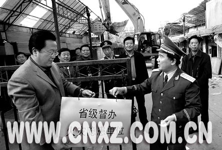 11月8日下午,省級督辦、市級掛牌的我市重大火災隱患單位宣武市場,由于其東市場的整體拆除而摘下了警示牌。這是我市歷史上第一次對重大火災隱患部位實施整體拆除。明年,一個現(xiàn)代化的新市場將在原址建成。